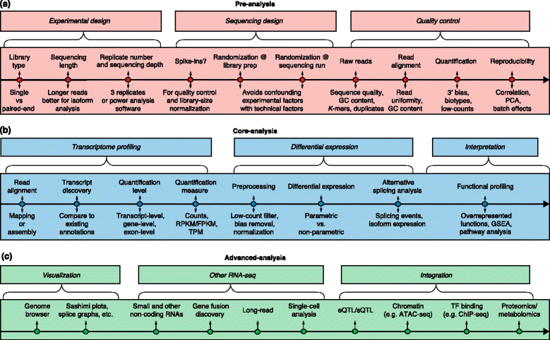 這份指南覆蓋了RNA-seq數(shù)據(jù)分析的所有主要步驟,比如質(zhì)量控制、讀段比對(duì)、基因和轉(zhuǎn)錄本定量、差異性基因表達(dá)、功能分析、基因融合檢測(cè)、eQTL圖譜分析等等。研究人員繪制的RNA-seq分析通用路線圖(標(biāo)準(zhǔn)Illumina測(cè)序),將主要分析步驟分為前期分析、核心分析和高級(jí)分析三類。前期預(yù)處理包括實(shí)驗(yàn)設(shè)計(jì)、測(cè)序設(shè)計(jì)和質(zhì)量控制。核心分析包括轉(zhuǎn)錄組圖譜分析、差異基因表達(dá)和功能分析。高級(jí)分析包括可視化、其他RNA-seq技術(shù)和數(shù)據(jù)整合。