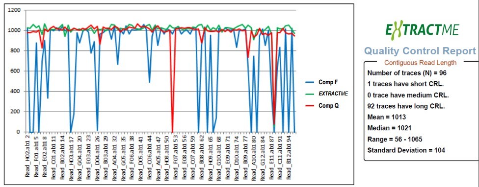 93個(gè)樣本分別使用EXTRACTME 和競爭者F、Q產(chǎn)品提取,提取產(chǎn)物進(jìn)行測序(NGS, Applied Biosystems),結(jié)果顯示EXTRACTME 提取質(zhì)粒均一化、完整性更好。